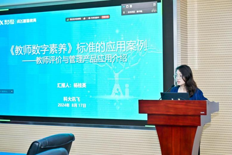 科大讯飞数字治理产品线智慧评价产品部杨桂英副总监代表产线在专题会议上进行主题分享,以教师评价与管理产品为例,从“标准细化落地、评估方法创新、学校数据实证研究”三个角度,对《教师数字素养》标准的应用实践进行了介绍。
