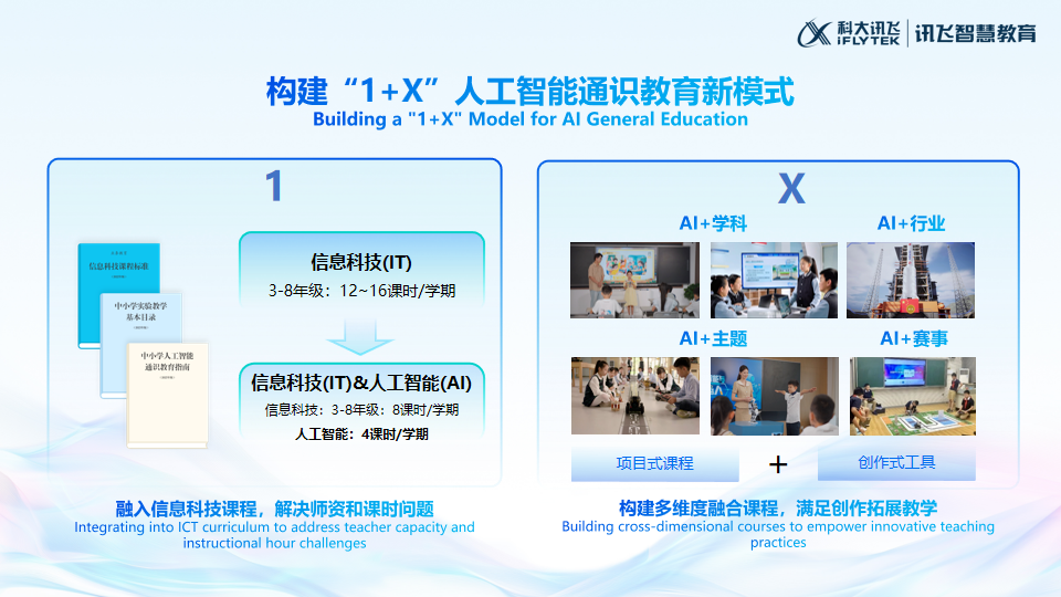 为支撑人工智能教育普及,科大讯飞提出了“1+X”新模式。“1”指在信息科技课程框架下,利用每学期4课时的时间系统开展人工智能通识教育,实现普及与普惠;“X”则面向不同地区和学校的特色需求,打造差异化的拓展课程,例如“AI+自动驾驶”等垂直方向探索。