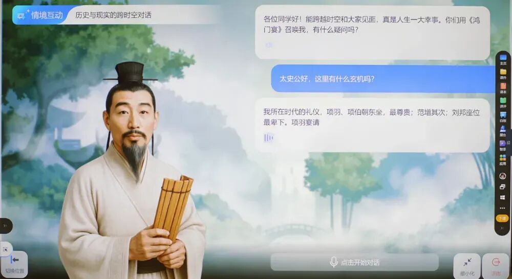 借助虚拟人助教,语文课上,学生能够跨越时空,与司马迁、李白等历史名人对话,还原历史场景,沉浸式探究文本细节;英语课上,学生可与虚拟人开展任意主题情景式英语对话,系统还能实时进行发音评测和语法纠错;数学、物理课上,大模型化身刘徽、伽利略、亚里士多德等虚拟名师,关联讲解跨学科知识,对学生进行引导式提问,并在学生发言后进一步反问、追问,激发学生深度思考。