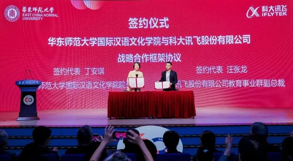 10月18日,在华东师范大学来华留学暨国际中文教育60周年活动开幕式上,华东师范大学国际汉语文化学院与科大讯飞股份有限公司正式签署战略合作框架协议。华东师范大学国际汉语文化学院院长丁安琪与科大讯飞教育事业群副总裁汪张龙作为双方代表出席签约仪式。