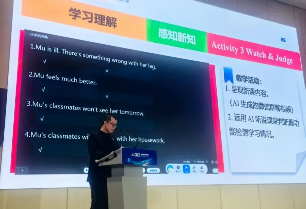 在分享环节,来自天津市和平区岳阳道小学的教师荆涛以《守正创新,智赋课堂——数智时代英语教学的实践与思考》为题,分享了基于科大讯飞“AI听说课堂”的精准教学实践。荆老师结合不同课例的备课场景,展示了自己运用AI让备课内容更生动的教学经验。