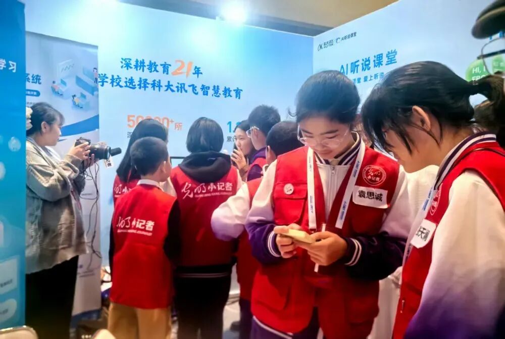 在场外的教育技术创新展上,阳光小记者们在讯飞展区深度体验AI听说课堂和AI英语宝,他们认为,人工智能语音评测技术的及时反馈对个人学习很有帮助。