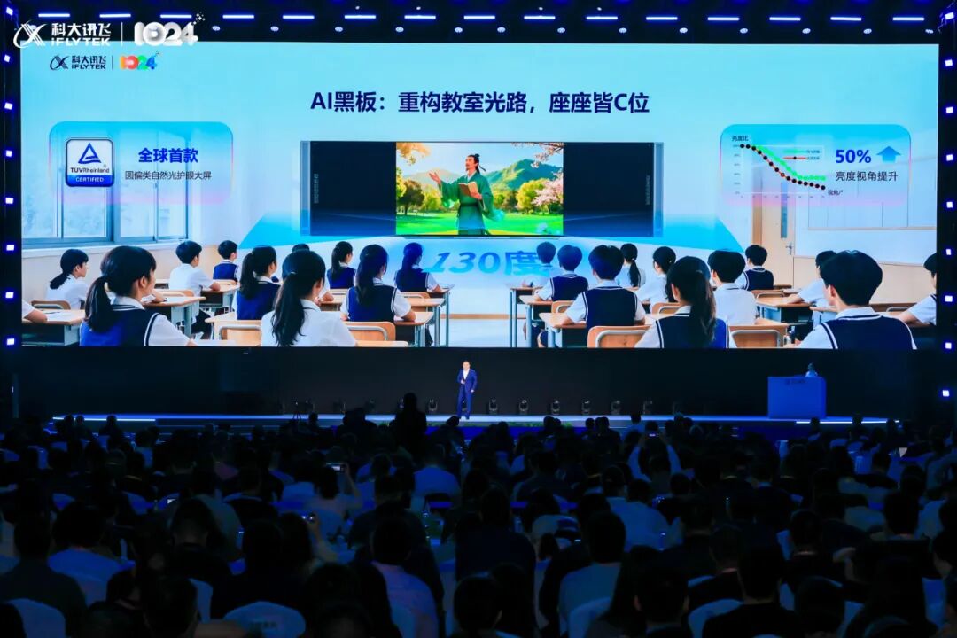 在视觉效果上,讯飞的AI产品也在不断突破。讯飞AI黑板搭载全球首款圆偏类自然光护眼大屏,模拟自然光影,130度超宽域显示,再也不用担心孩子看不到黑板。