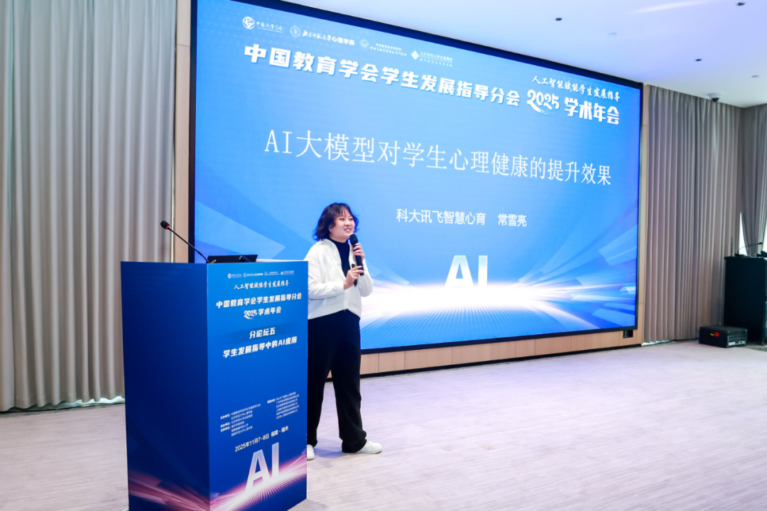 11月7日-8日,中国教育学会学生发展指导分会2025学术年会在福建福州举行。在“学生发展指导中的AI应用”主题分论坛中,科大讯飞智慧心育研究院院长常雪亮作《AI大模型对学生心理健康的提升效果》主题报告,探讨了以多模态大模型、软硬件一体化保障及人机协同为特点的心育实践路径,并分享了基于AI中枢的新一代家校一体化心育平台。