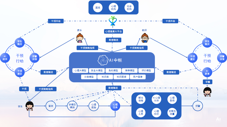 报告还介绍了基于AI中枢的新一代家校一体化心育平台。该平台通过家校协作,将学生、家长、学校等多方参与者的干预事项统一汇聚至AI中枢。中枢基于多源信息生成全面立体的学生画像,并作为“指挥中枢”智能调度学生、家长、教师等各角色的任务,使心理干预更加科学化、专业化和精准化。