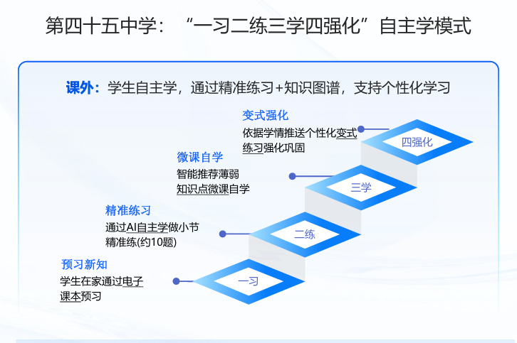 比如在合肥第四十五中学沉淀出的“一习二练三学四强化” 自主学模式,学生在2024年暑假减少知识弱项3.95万条,知识点解决率达 79.3%。