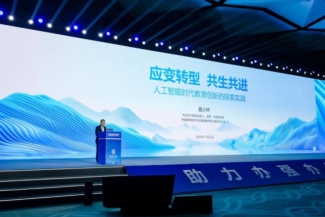 科大讯飞联合创始人、董事、高级副总裁聂小林参加大会主论坛并做《应变转型 共生共进——人工智能时代教育创新的探索实践》主题分享。他强调,“AI与教育不是独角戏,而是双向赋能与激发。AI将拥有全世界的知识,但永远不会替代老师。未来不属于AI,而属于掌握AI的新人类、新教师、新教育工作者。”