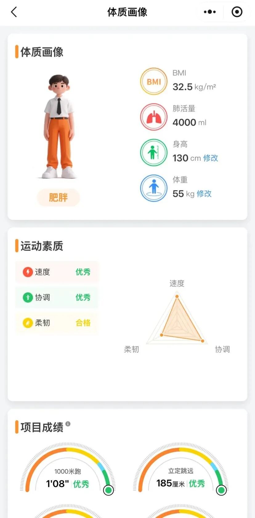 基于AI体育教学一体机、AI体育测练机等智能测评设备,学生每次的练习成绩都可以实时记录,不仅能提高数据准确性,更能对学生常态化运动数据进行整合分析,形成个性化体质健康报告,帮助老师和家长了解学生体能水平变化情况,让健康学校建设效果真正看得见。