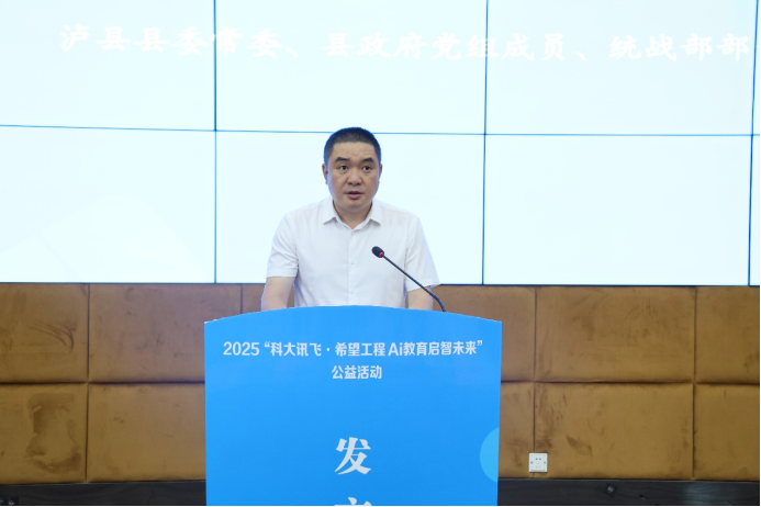 泸县县委常委王先奎在致辞中表示,人工智能时代,科技的力量正在重塑教育与学习方式,科大讯飞积极履行社会责任,公益足迹遍布多地,为众多学校带去人工智能教学解决方案,让大量学子享受到优质教育资源。此次活动通过前沿人工智能技术,激发了孩子们对科技的向往。他向同学们提出三点希望,希望同学们培根铸魂立志向、勤学砺行练本领、感恩奋进修品行,成为对国家和社会有用的人。