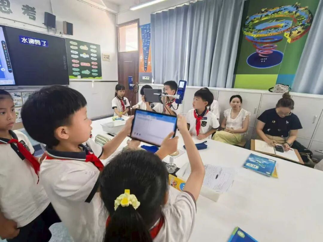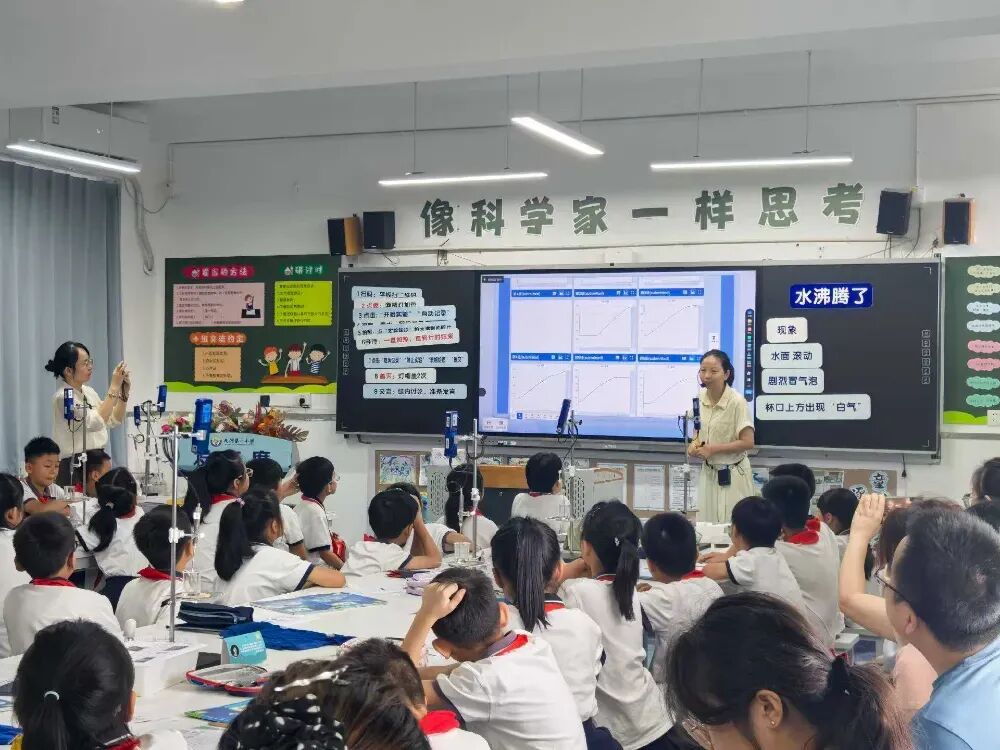 9月16日,龙湾区天河第一小学成功举办“人工智能赋能科学实践”主题公开课活动。本次活动邀请了龙湾区教师发展中心科学教研员林孝亮老师、天河第一小学校长方晓霞以及全区科学教研组长参与现场听课。天河一小涂黎娜老师以教科版三年级上册《水沸腾》为课题,依托科大讯飞数字化探究实验室开展创新教学实践。通过温度传感器与学生机的联动,实现实验数据秒级采集与云端同步,不仅清晰展示水在不同温度下的变化规律,更引发在场教师对数字技术如何重塑科学教育形态的深入思考。
