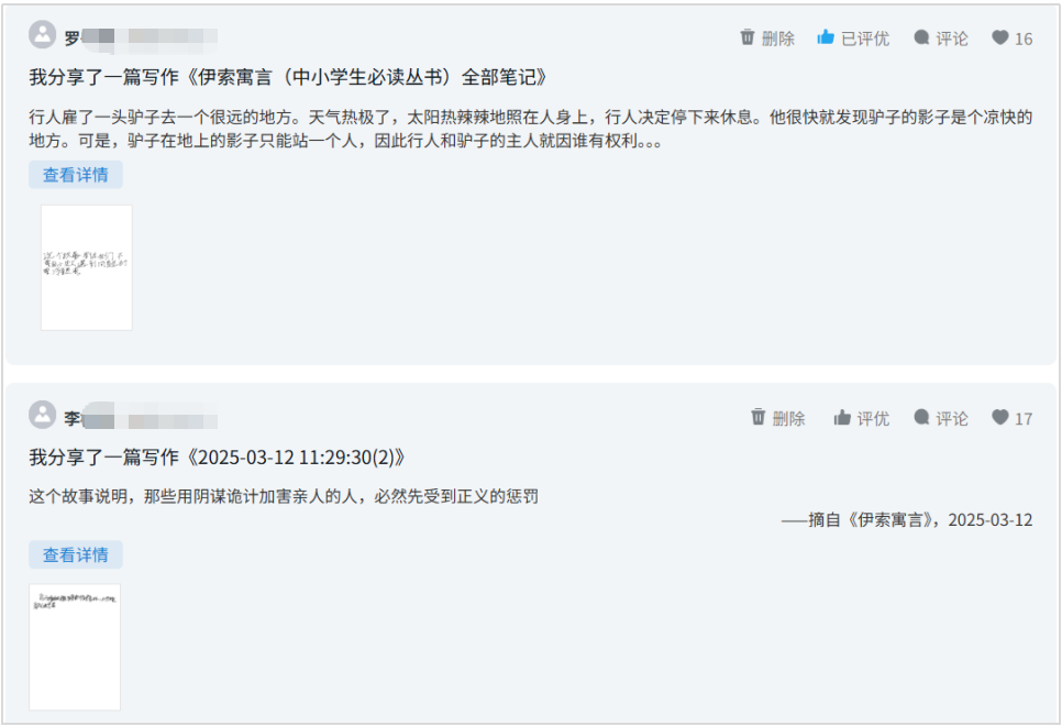课堂之外,阅读并未止步。无论是在教室、图书角、家中,还是校园长廊,学生均可随时登录平台继续阅读,实现“课堂启航、随处可续”的智慧阅读闭环。教师还可以通过平台发起“寓言解决实际问题”主题讨论,推动学生从理解走向应用,并适时推荐《克雷洛夫寓言》等拓展读物,引导中西方寓言对比,拓宽文化视野。这一模式让阅读成为连接课堂与生活、贯穿学习全程的完整体验。