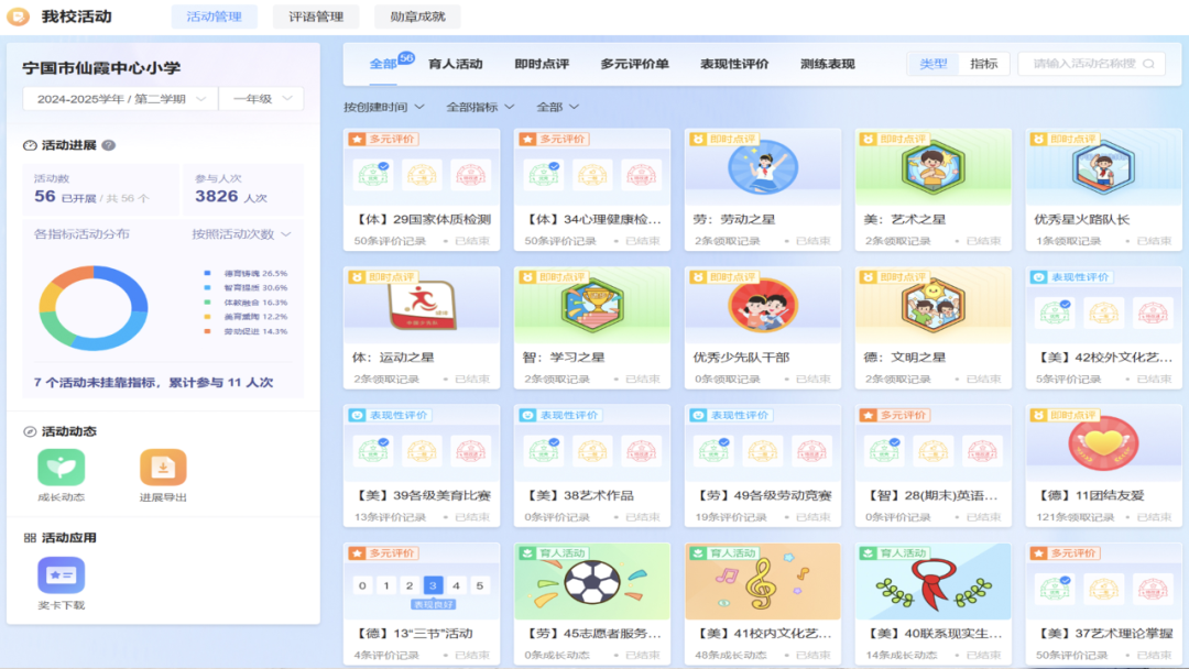 对学校管理来说,系统更像一位“沉默的督导员”。德育处主任点开“五育驾驶舱”,屏幕上实时显示各班级指标完成情况,他表示:“你看从这看到三(2)班的升旗仪式上传次数较少,联系班主任就能及时了解情况。从凭经验判断到用数据说话,管理效率提上去了,育人方向也更准了。”
