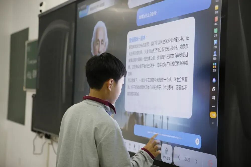 王龙老师的《地球的自转》一课以一场创意开场惊喜亮相——虚拟人“爱因斯坦”穿越时空,瞬间点燃学生的探索热情。在这场跨越时空的对话中,学生带着对宇宙的好奇,踏上探索地球自转规律的奇妙旅程。课堂上,王老师巧妙融合演示与实践:地球自转动画面徐徐展开,学生随即在交互式电子地图上精准标出南北极与自转方向;手电筒照射地球仪的经典实验,则以直观动态方式揭示昼夜交替的奥秘。