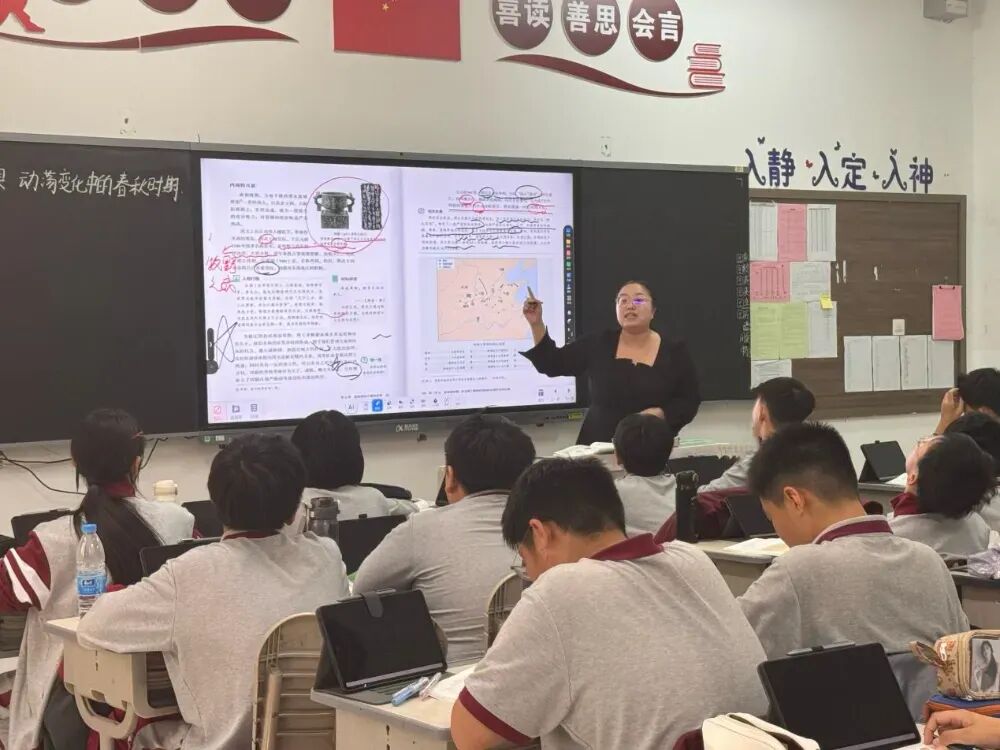 其他课堂同样精彩纷呈:历史课上,王惠瑾老师以动态图谱串联春秋风云;生物实验室中,付喜华老师借助双屏协同,将微观细胞世界化为可触可感的知识图谱;政治课堂变身为思维竞技场,郭晓敏老师设计的PK赛制让解题策略深入人心;物理实验室内,李柯欣老师指导学生绘制温度变化曲线,用数据之美揭示物质变化的奥秘。每一堂课都是思维激荡的舞台,每一次互动都激活着创新探索的涟漪。