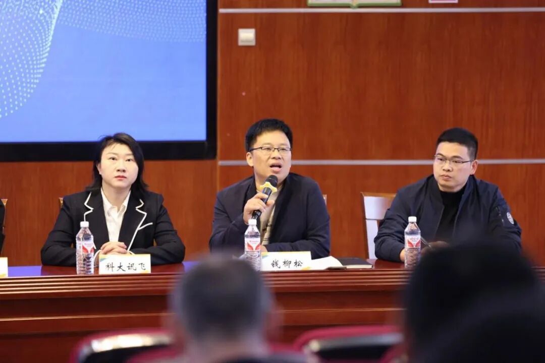 婺城区教育局副局长郑建忠、后勤服务中心主任钱柳松,婺城区大数据发展中心副主任徐良、数据资源科科长黄晓佳,科大讯飞浙中区域总经理程春玲,婺城区教研室教育技术中心主任周杰、中小学信息科技教研员郑理新,金华市青春小学校长韩峰及全体中小学分管副校长及各学校AI项目落地负责人出席此次会议。