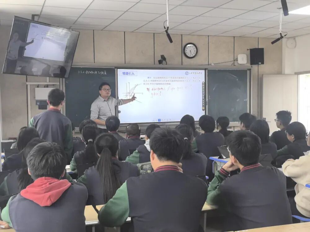 随后,合肥九中数学教师杨大武带来《抛物线的性质二》一课。他借助GGB动画演示,引导学生发现焦点弦变化规律,并运用坐标法解决问题。课堂氛围活跃,学生主动提出问题、分析问题、解决问题,充分体现现代技术在数学探究中的教学价值。课后,教师围绕智慧课堂技术融入数学教学进行了深入交流与研讨。