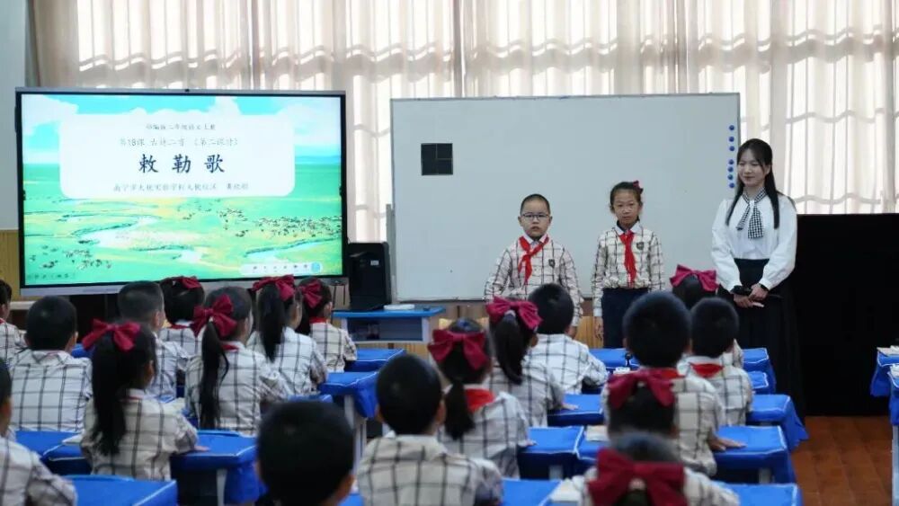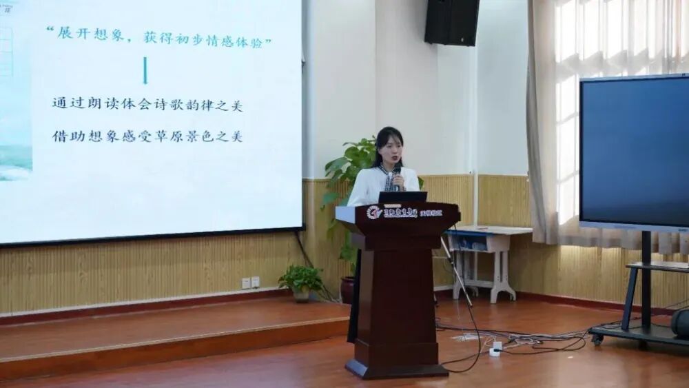 课堂上,黄老师将天桃校区“海量阅读”教学特色与“AI语文课堂”的科技赋能相结合,通过学生自由读、AI老师跟读、鹦鹉学舌读等多种形式,搭配AI语文课堂软件与答题器,让课堂流程化繁为简。学生全员踊跃参与,自信朗读、大胆想象,仿佛置身草原情境中,展现出高度投入的学习状态。观课教师直观感受到智能科技为传统诗歌教学带来的创新与变革。