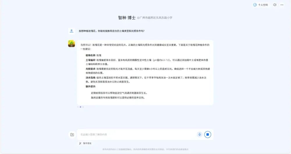 “智种博士”智能体作为植物栽培专业顾问,通过语音与文本交互精准诊断植物健康问题、推荐种植品类与时序,提升劳育实践的科学性与实效性,让学生在亲身体验中同步收获知识素养与劳动精神。