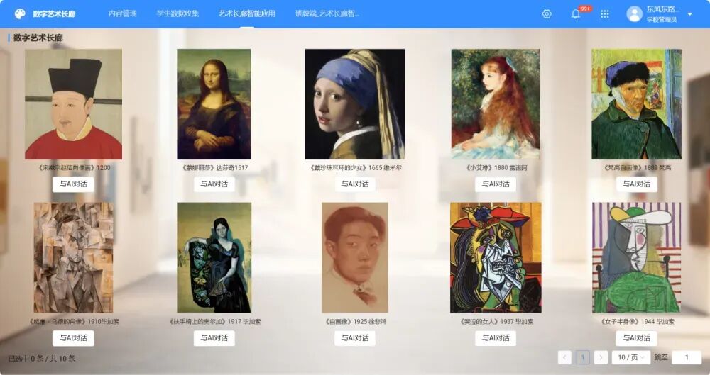 学校数智基座里的“数字艺术长廊”与“非遗导览助手”两款应用,成为学校师生的“艺术伙伴”。通过多模态互动让美育教学更具张力,学生可与名画对话、探秘非遗故事,老师可以引导学生解读“数字艺术长廊上”的艺术名画、表达艺术观点,鼓励学生与AI对话,探索名画背后的故事。AI还会全程记录学生的提问数据,老师可以根据问题数据精准捕捉学生兴趣点,灵活调整教学策略,实现“以学定教”。