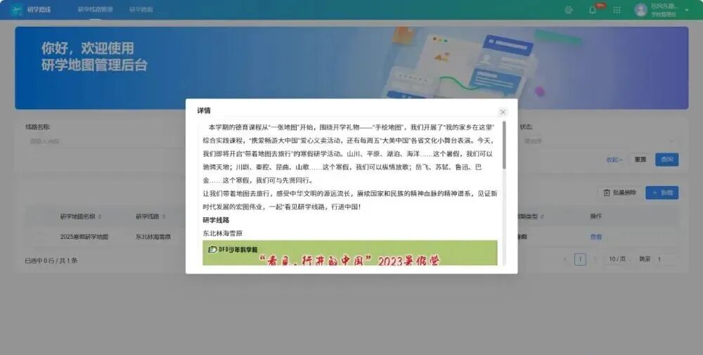 以德育引领为核心,学校为小学1-6年级师生打造了“智能研学新体验”。平台以一张“中国地图”为研学载体,助力学校从课堂内的家乡故事、校园实践等活动,延伸至“带着地图去研学”的真实场景。学生可与研学导师对话,生成个性化研学攻略和研学报告,实现从路线规划、实践记录到成果凝练的全流程数字化,形成“导览-实践-凝练”的闭环育人路径。