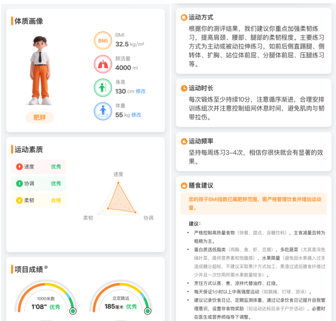 学校依托智慧体育系统,为每一位学生建立动态健康数字档案,构建个性化体质画像,实现“一人一档、精准施策”。系统持续追踪学生体测成绩、日常运动数据及体能变化趋势,结合BMI、肺活量、柔韧度等核心指标,自动生成个性化运动处方,同步提供针对性训练建议和膳食参考,助力学生科学提升体能、改善体质,尤其针对肥胖、柔韧不足等突出问题,实现精准干预。
