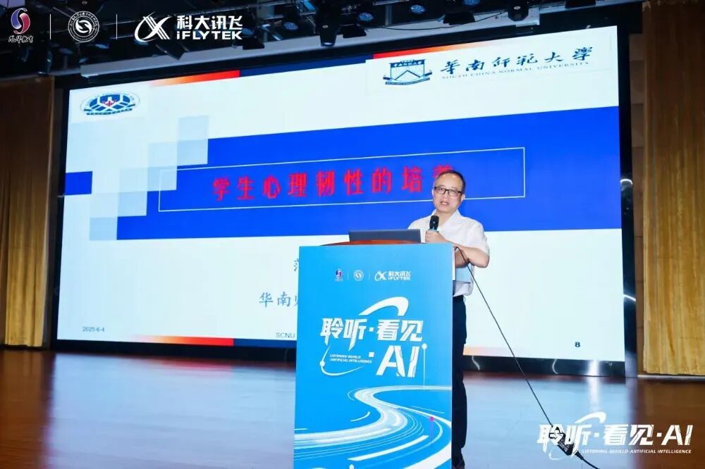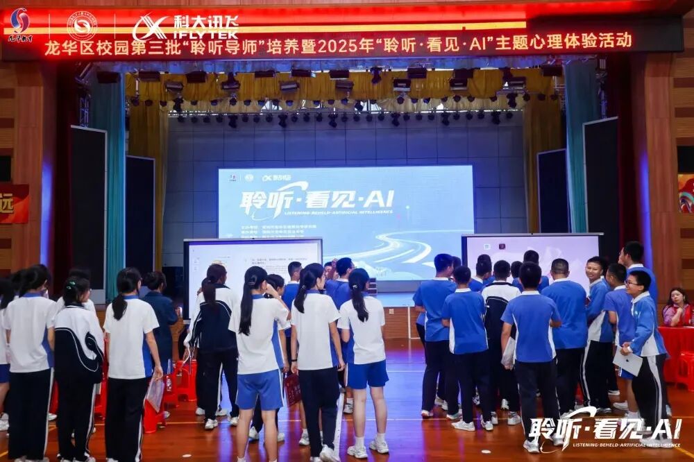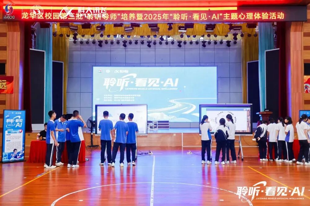 6月4日-5日,深圳市龙华区校园第三批“聆听导师”培养暨2025年“聆听·看见·AI”主题心理体验活动成功举办。此次活动为期两天,由深圳市龙华区教育科学研究院主办,深圳市龙华区民治中学教育集团承办,科大讯飞股份有限公司协办。活动通过专题讲座、心理游园会、交流互动等环节,助力AI与心理健康教育的深度融合,为教师探索AI驱动心理教育实践提供专业指导,提升心理教育科学性与实效性。区委教育工委委员,区教育科学研究院院长李渝忠出席活动,全区中小学校分管心理的副校长、德育主任、家庭教育负责人、班主任、心理专职教师近900人参加。开班仪式上,李渝忠为活动致辞。他强调本次培训创新性地将人工智能技术与心理健康教育相结合,旨在提升教师心理辅导能力,为校园心理提供更个性化、智能化的体验。参训教师要珍惜学习机会,将AI心育技术融入日常教学,同时加强交流合作,共同营造校园心理健康教育新生态,为龙华区教育高质量发展贡献力量。松和小学张龙老师作为班委代表郑重承诺,全体学员将以“学习者和传播者”的双重角色投入培训,既要掌握专家传授的辅导技能,更要搭建实践交流平台,促进经验共享与智慧碰撞。他表示,在AI时代更要坚持“人性化聆听”,用教育温度守护每个孩子的成长心声。“‘聆听计划’启动以来,极大地丰富了老师们的心理知识储备”,未来小学心理老师李玫作为学员代表发言,她感谢教科院提供的学习平台,分享了参与“聆听计划”的收获。面对AI时代的教育新挑战,她期待与学员们共同探讨技术赋能心理健康教育的新路径,发挥教育工作者的独特价值。本次培训特邀多位心理健康教育领域专家开展专题授课。系列课程既立足当下教育痛点,又着眼未来发展趋势,为心理健康教育工作提供了全方位的专业支持。北京师范大学心理学博士研究生、科大讯飞智慧心育研究院长常雪亮向学员详细介绍了AI大模型在青少年心理筛查和干预中的应用效果;华南师范大学二级教授范方分享了学生心理韧性的实践培养方案;清华大学深圳国际研究生院教授、广东省数字心理健康与智能生成实验室倪仕光创新性地探讨严肃游戏在心理健康教育中的运用;深圳市教育科学研究院正高级研究院、市中小学心理健康与家庭教育指导中心副主任王秋英从家庭互动系统视角解读青少年心理健康问题;华南师范大学心理学博士、深圳大学社会学系副教授高秋凤针对青少年手机成瘾问题提供专业干预策略。活动同期创新推出“AI心理巡礼,欢乐校园游”主题游园会,在民治中学体育楼二楼设置八大AI心理体验区,为学生提供沉浸式心理体验。学生们手持体验卡,通过AI对话、互动挑战等方式学习心理健康知识。各区域独具特色,“心理疗愈区”采用私密化设计,让学生在与AI心理伙伴对话过程中获得正向反馈;“目标管理区”基于AI互动测试,帮助学生生成个性化的测评报告;“暖心赞美区”通过“1分钟赞美”知识模块学习与实践,获得愉悦体验……继2023年龙华区推出了中小学心理健康教育的“聆听计划”,通过培养专业"聆听导师"队伍,构建"教师-学生-家长"三位一体的心理健康支持体系。截至目前,已培养“聆听导师”570余名,开展专题培训30余场,覆盖全区所有中小学。