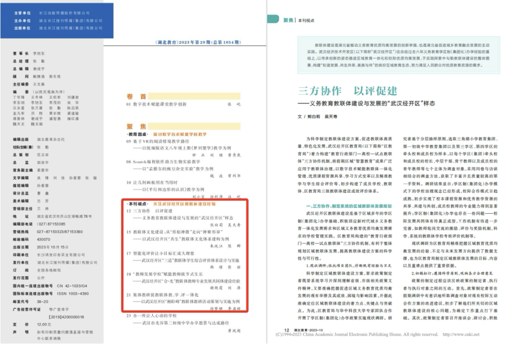 基于片区教育发展不均衡,整体呈现北强南弱的现状,经开区在学区制基础上,借助AI教研平台等信息化手段,发展网络协同教研,推动从“学科工作坊”到“学科基地校”和从“学区制”到“教联体”的高效过渡和转变。目前,全区组建12个义务教育教联体。2023年10月初,湖北省级教育学类学术期刊《湖北教育》,刊登了5篇文章,分别从区域和四个试点教联体的不同视角对经开区教联体建设典型经验进行了全方位报道。